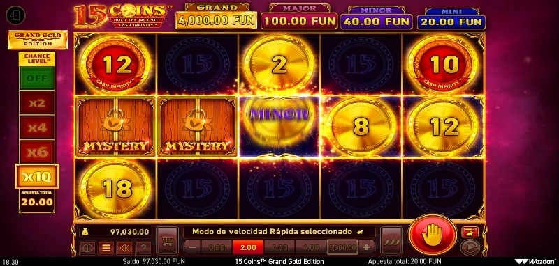 15 Coins Grand Gold Edition 4.2/5 Valoración Sin reseñas Opiniones (0) Wazdan Proveedor 1 Líneas 5,000.00€ Apuesta Máx. 0.25€ Apuesta Mín. x2.000 Premio Máx. 5x3 Rodillos 96.18% RTP Alta Volatilidad Jugar gratis Jugar por dinero real Escrito por Valery LemanovActualizado: 01/11/2025 Pros:Los valores Cash e Infinity vuelven a tener máximos ampliados por ser una Gold EditionEl max win se duplica frente a su versión originalPodemos adaptar la tragaperras con su volatilidad ajustable y ante bet además de usar el bonus buy Contras:Su innovación sigue siendo muy cortaEl premio máximo podría ser más altoLas apuestas anticipadas más alta son muy caras en comparación a otros juegos de competidores15 Coins™ Grand Gold Edition slot: ¿La evolución dorada del formato 5x3? La slot 15 Coins™ Grand Gold Edition fue lanzada el 31 de enero de 2024 por Wazdan como la versión premium del formato 5x3 introducido con 15 Coins en junio de 2023. Con un max win x2.000 y manteniendo la identidad del tablero de 15 posiciones, esta edición duplica el potencial de premio de la versión base mientras conserva el equilibrio visual que caracteriza este formato horizontal de la saga. El proveedor mantiene las mecánicas fundamentales como el bonus Hold the Jackpot™ que se activa con 5 símbolos en la fila central, los símbolos Cash Infinity™ ahora con valores premium de x5 a x15 y la volatilidad ajustable que permite adaptar la experiencia según tu perfil de riesgo. Te lo contamos todo en esta reseña completa donde encontrarás una demo gratis 15 Coins Grand Gold Edition para probar esta versión Gold de la familia Coins™. Temática, gráficos y sonido El concepto de riqueza y opulencia se materializa con una paleta cromática dominada por tonos dorados intensos que imitan la estética de la versión base de 15 Coins. Las animaciones lumínicas mantienen el nivel espectacular característico de las ediciones Gold, con efectos de brillo que se intensifican durante la aparición de símbolos de alto valor y la activación del bonus. La fluidez de giros se mantiene impecable, incluso con múltiples funciones activas simultáneamente. La banda sonora onírica incorpora capas electrónicas igual de refinadas que en la versión base, con efectos sonoros sincronizados perfectamente con las animaciones para generar tensión progresiva durante las fases críticas del juego. Cómo jugar 15 Coins™ Grand Gold Edition demo slot Jugamos con un tablero de 5 carretes y 3 filas que forma 15 posiciones, donde la única línea de pago es la fila central que al completarse con 5 símbolos activa el bonus Hold the Jackpot. Veamos cómo proceder con esta slot online: Establece un presupuesto responsable para mantener el control sobre tus fondos y evitar perseguir pérdidas. Selecciona tu apuesta por tirada, desde la mínima de 0,25 €/$ en nuestra demo hasta la máxima de 5.000 €/$. Ajusta el nivel de volatilidad mediante los Volatility Levels™, eligiendo entre baja, estándar o alta según tu estrategia de juego. Consulta la tabla de premios en la interfaz para familiarizarte con los valores de cada tipo de premio. Activa el Chance Level™ (x2, x4, x6 o x10) si deseas aumentar las probabilidades de activar el bonus. Tu apuesta se incrementará proporcionalmente en esta ante bet. Si tu bankroll lo permite, considera usar la compra de bonus para acceder directamente a la fase Hold the Jackpot con diferentes configuraciones según volatilidad. Configura el modo automático, turbo o establece límites de pérdidas/ganancias desde los controles avanzados. Utiliza la función gamble para doblar tus premios tras cada ganancia, adivinando el color correcto que el RNG (generador de números aleatorios) mostrará, hasta el máximo establecido por tu operador. Funciones especiales La tragaperras 15 Coins™ Grand Gold Edition mantiene el arsenal completo de la saga con valores optimizados para el formato 5x3: Cash symbols: monedas doradas con valores entre x1 y x10 la apuesta, formando la base del sistema de premios instantáneos. Cash Infinity™: monedas especiales con valores de x5 a x15 la apuesta que permanecen fijas hasta finalizar el bonus, igualando los valores premium de las ediciones Grand. Jackpot Symbols: sistema escalonado con Mini (x10), Minor (x20), Major (x50) y el Grand Jackpot (x2.000). Mystery Symbols: revelan premios aleatorios al finalizar el bonus, pudiendo transformarse en cualquier símbolo, excepto Cash Infinity™. Collector Symbols: acumulan los valores de todas las monedas presentes en el bonus y aplican un multiplicador aleatorio de hasta x20 al total recolectado. Jackpot Mystery: se convierten exclusivamente en uno de los tres jackpots menores (Mini, Minor o Major). Fase bonus: Hold the Jackpot La activación requiere 5 símbolos de bonus en la fila central del tablero base, adaptado al formato 5x3. Una vez desencadenado, el jugador obtiene 3 respins que se renuevan automáticamente con cada nuevo símbolo que aparezca. Todos los símbolos presentes quedan bloqueados al iniciar esta fase especial. El objetivo es llenar las 15 posiciones disponibles, lo que otorga el Grand Jackpot de x2.000 la apuesta, duplicando el max win x1.000 de la 15 Coins base y posicionándose como la versión más lucrativa del formato 5x3. 15 Coins Grand Gold Ed.: Bonus buy Volatilidad del bonus Precio Figuras iniciales que activan el bonus Baja x50 4 Cash Symbol + 1 Cash Infinity Media x75 3 Cash Symbol + 1 Cash Infinity + 1 Mystery Alta x150 3 Cash Symbol + 2 Cash Infinity + 1 Mystery Extreme x300 5 Cash Infinity + 1 Mystery + 1 Jackpot Mystery Double Extreme x600 5 Cash Infinity + 2 Mystery + 1 Jackpot Mystery 15 Coins™ Grand Gold Edition: RTP y volatilidad Retorno al jugador (RTP): 96,18%. Volatilidad: alta, ajustable mediante los Volatility Levels™. Premio máximo: x2.000 la apuesta. Rango de apuestas: 0,20 €/$ – 10.000 €/$ (según operador). Frecuencia de premios: N/D Frecuencia de bonus