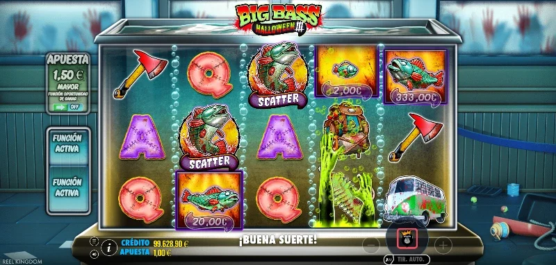 Big Bass Halloween 3 3.8/5 Valoración Sin reseñas Opiniones (0) Reel Kingdom Proveedor 10 Líneas 250.00€ Apuesta Máx. 0.10€ Apuesta Mín. x5.000 Premio Máx. 5x3 Rodillos 96.50% RTP Alta Volatilidad Jugar gratis Jugar por dinero real Escrito por Valery LemanovActualizado: 03/11/2025 Pros:Juego de bonificación con doble bonusTenemos la opción de comprar dos tipos de tiradas gratisAnimaciones sangrientas y con multitud de funciones bien implementadas Contras:Tenemos una ficha técnica poco atractiva con una baja frecuencia de premios, alta volatilidad y un premio máximo muy bajoNinguna de las mecánicas es nueva, son funciones recicladas de otros juegosEl doble bonus tenía animaciones potentes en su entrega de boxeo que no se han aprovechado en el storytelling del juegoTragaperras Big Bass Halloween III: ¿La trilogía culmina con una batalla por la supervivencia? La slot Big Bass Halloween III es la tercera entrega de la saga terrorífica desarrollada por Reel Kingdom y distribuida por Pragmatic Play el 15 de octubre de 2025. Tras la versión clásica de 2023 y la evolución zombie de 2024, esta nueva iteración introduce un sistema de doble bonus con dos medidores paralelos: el pescador azul y el zombie rojo luchando uno contra uno. Con un grid 5x3, 10 líneas fijas y volatilidad alta, esta tercera parte mantiene el premio máximo de x5.000 mientras recicla mecánicas que prometen dinamizar las sesiones de pesca nocturna. Vamos con este análisis completo donde también encontrarás la demo gratuita para jugar sin arriesgar tu dinero. Temática y ambientación El lago maldito alcanza su tercer Halloween consecutivo, y esta vez la infección no solo ha transformado a los peces en criaturas putrefactas. El pescador original ha perdido mucho más que un ojo, ha perdido a un hermano pesacodor a manos de lo que sea que convierta a las personas en monstruos devoradores de carne humana. Ha conseguido un refugio temporal en el acuario de la ciudad, pero los zombies lo tienen rodeado y una extraña sensación inunda sus pensamientos, ¿de verdad es este un lugar seguro para aguantar? Gráficos, animaciones y sonido El diseño visual mantiene el tono gore y sangriento de la versión 2024 pero con un abanico de colores azules en contraste con los cálidos con los que se buscaba crear una atmósfera más putrefacta. Aquí nos encontramos en lo que podría ser un acuario con paredes blancas y translúcidos cristales llenos de marcas de sangre. El estilo de los símbolos sigue con una temática sangrienta y las animaciones son impactantes debido al impacto visual y un buen trabajo dentro de la línea de un apocalípsis zombie. Incluso veremos animaciones algo más cómicas como cuando logremos línea con la furgoneta. Las animaciones son brutales y sangrientas cuando logramos líneas ganadoras, especialmente con símbolos de bajo valor que se desgarran en pantalla. Los efectos más impactantes llegan durante las transiciones del bonus cuando aparecen las funciones aleatorias: el tiburón devorando símbolos, el anzuelo sangriento arrastrando scatters o la dinamita explotando en vísceras. En el apartado sonoro, tenemos una melodía tipo survival horror con cierto matiz country al utilizar un banjo como instrumento que marca el ritmo. También tenemos efectos de sonido como la recarga de un arma de fuego en cada giro o un ligero zumbido gutural de los zombies cuando esperamos el tercer Scatter. Cómo jugar Big Bass Halloween III slot Jugamos en una cuadrícula clásica de 5 carretes y 3 filas, con 10 líneas de pago fijas que pagan al alinear 3 o más símbolos iguales de izquierda a derecha. Los pagos por combinación van desde x0,20 hasta x200 la apuesta según el símbolo y cantidad. Vamos ahora con unos pasos básicos para jugar a las tragaperras: Define tu bankroll fijo sin perseguir pérdidas una vez se agote. Define tu juego entre la apuesta mínima que va desde 0,10 €/$ hasta una apuesta máxima de 250 €/$ por giro. Recuerda revisar la tabla de pagos junto con las reglas del juego para comprender el funcionamiento del sistema de doble medidor en el bonus. Puedes activar la ante bet pagando un 50% extra para aumentar las probabilidades de activar los giros gratis. Si entra en tu estrategia de juego y el operador lo tiene habilitado, podrás comprar el bonus normal por x100 tu apuesta o los Super Free Spins por x300 tu apuesta. En esta versión, solo necesitarás 3 comodines para aumentar tu multiplicador y obtener esos 10 extra spins. Funciones especiales En esta tercera entrega, Big Bass Halloween III evoluciona el sistema clásico introduciendo un doble medidor de progresión similar al visto en Big Bass Vegas y otras entregas recientes de la saga: Símbolos Funciones Money Fish (Peces de dinero) Símbolos de peces muertos sangrientos que aparecen con valores instantáneos aleatorios desde x2 hasta x5.000 tu apuesta. Solo se cobran cuando un wild los recolecta durante el bonus. Scatter 3, 4 o 5 scatters activan el bonus otorgando 15, 20 o 25 giros gratis respectivamente. Wild Pescador (Azul) Aparece solo en free spins, sustituye cualquier símbolo estándar y recolecta todos los valores de Money Fish en pantalla. Cada 4 wilds azules añaden +10 giros y progresan el multiplicador azul (x1 → x2 → x3 → x10). Wild Zombie (Rojo) Segundo tipo de wild que también aparece solo en bonus, con la misma función recolectora. Cada 4 wilds rojos añaden +10 giros y progresan el multiplicador rojo independiente (x1 → x2 → x3 → x10). Funciones aleatorias: La ayuda inesperada Durante las partidas, pueden activarse varias funciones aleatorias que dinamizan tanto el juego base como el bonus: Nombre Fase Función Respín Mortal Juego base Cuando aparecen 2 scatters con espacio para desplazarse hacia abajo sin salirse del grid, estos avanzan una posición mientras el resto de carretes hacen respín. Anzuelo Sangriento Juego base Si tenemos 2 scatters en pantalla tras una tirada, puede 