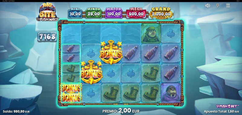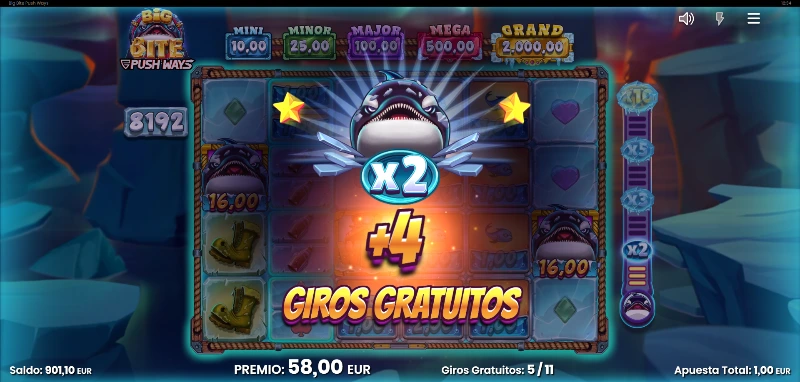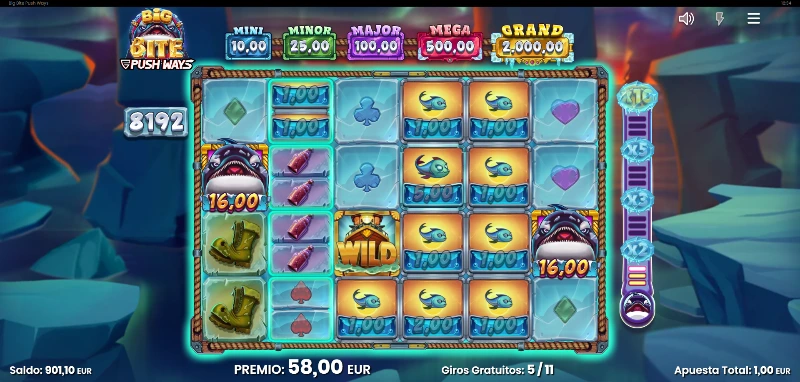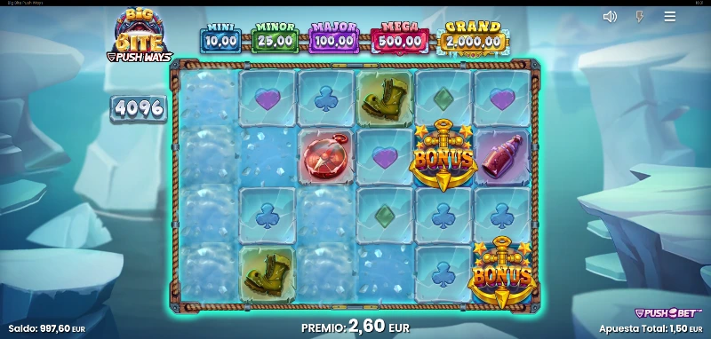 Big Bite Push Ways 2.9/5 Valoración Sin reseñas Opiniones (0) Push Gaming Proveedor All Ways Líneas 100.00€ Apuesta Máx. 0.10€ Apuesta Mín. x4.941 Premio Máx. 6x4 Rodillos 96.27% RTP Baja Volatilidad Jugar gratis Jugar por dinero real Escrito por Valery LemanovActualizado: 16/10/2025 Pros:Cambiamos a un sistema de líneas dinámico con función de cascadasNueva herramienta de Zonas Calientes que duplica el potencial de cualquier símbolo que afecteUn tablero mucho más grande que se expande durante los giros gratis Contras:Se ha reducido el premio por línea de x200 a x2El premio máximo baja de x10.000 a x4.941Se reduce también el RTP (-0,05 %) a pesar de ser ahora una slot de baja volatilidadEl Grand Jackpot ahora es de x2.000 frente a los x10.000 de antesBig Bite Push Ways slot: ¿Quién se ha comido el premio máximo de su versión original? La tragaperras Big Bite Push Ways es un juego desarrollado por Push Gaming, lanzado al mercado el 12 de marzo de 2025. Este título representa la evolución directa de Big Bite slot (2024) con su original sistema Push Ways en un formato expandido de 6 carretes con 4 a 8 filas dinámicas que permitiendo así un sistema de pago All Ways. Bajamos a una volatilidad baja en esta nueva entrega añadiendo a su vez cascadas de símbolos y manteniendo el resto de funciones como esa sinergia entre símbolos de dinero y figura collect. ¿Qué otros cambios encontraremos en esta versión actualizada de la slot de la orca? Lo podrás descubrir leyendo nuestra reseña del juego o jugando gratis Big Bite Push Ways gracias a la demo sin registro que encontrarás dentro del artículo. Temática y ambientación Algún valiente ha vuelto de las gélidas aguas árticas contando que gracias a su astucia, logró hacer que una orca pescara por él peces de gran valor. ¿Cómo es eso siquiera posible? Además, ¿quién podría creerse una historia así? Gráficos, animaciones y sonido El estilo visual mantiene la estética polar con una paleta de azules y blancos que encontramos tanto en su helado fondo como en el tablero lleno de símbolos encerrados en bloques de hielo. Los colores de las figuras de pago y símbolos especiales contrastan con vivos colores, sin cambiar en su diseño y acabado mate. En cuanto a los movimientos en pantalla, seguimos con una buena fluidez entre giros y animaciones sencillas bien trabajadas. Las animaciones para big wins siguen destacando al aparecer a toda pantalla y con efectos de partículas de luz muy atractivos. La banda sonora reutiliza el tema musical calmado del original, entremezclado con sonidos de naturaleza salvaje y efectos acuáticos que ambientan ese contexto polar. Cómo jugar Big Bite Push Ways demo slot Esta tragaperras online nos ofrece un tablero mayor al de la entrega de 2024, aquí empezamos con 6 carretes y 4 a 8 filas. Un aumento que supera incluso al 5x5 expandido que nos ofrecía su bonus, además dejamos atrás un sistema de líneas fijas y tenemos ahora un All Ways siempre y cuando haya un mínimo de 3 símbolos iguales consecutivos empezando por el carrete izquierdo. Las combinaciones ganadoras ahora ofrecen un rango de premios menor a la versión original debido a este cambio en sus líneas de juego, ofreciendo recompensas que van de x0.10 a x2 la apuesta. Tras ver los cambios y básicos de esta slot de Push Gaming, vamos a pasar a unos breves consejos para apostar con cabeza: Establece un bankroll fijo, y disfruta de la volatilidad baja que genera premios muy frecuentes con rachas mínimas. El rango de apuesta fluctúa entre 0,10 €/$ y 100 €/$, acomodando diferentes presupuestos. Volveremos a poder activar la ante bet (Push Bet), aumentando nuestra apuesta un 50% pero incrementando nuestra probabilidad de entrar al bonus un 148%. Consulta la tabla de pagos para entender los nuevos valores, mecánicas añadidas y cualquier otro detalle importante. Según tu estrategia de juego y si el operador la tiene habilitada, podrías comprar el bonus pagando x120 tu apuesta. Funciones especiales Esta tragamonedas online construye su experiencia alrededor del sistema Push Ways expandible, Hot Zones que duplican símbolos, la orca colectora, cascadas y free spins con progresión: Funciones ¿Qué es o qué hace? Wild (Barco) Comodín que sustituye a todos los símbolos de pago estándar y paga igual que el símbolo alto más valioso cuando forma líneas propias. Premios directos (Peces) Premios instantáneos que aparecen en los carretes 2, 3, 4 y 5. Muestra valores entre x1 y x100 la apuesta. Premios con bote (Almejas y perlas) Los jackpots aparecen también solo entre los tambores 2 y 5, siendo: Mini (x10), Minor (x25), Major (x100), Mega (x500) y Grand (x2.000). Figura recolectora (Orca) Los símbolos collect aparecen en los carretes 1 y 6. Recolecta todos los valores visibles, aplicando su multiplicador (x1 a x10) tanto en el juego base y bonus. Scatter (Ancla) Activa free spins con 3 o más en cualquier posición del tablero. Cascada Es lo que conocemos en otros juego como función tumble. Esta nos permite que cuando una combinación genere premio, desaparezca y deje paso a nuevos símbolos desde arriba, pudiendo crear un efecto en cadena en una misma tirada normal o gratis. Push Ways y Hot Zones: ¿Qué es esta función? El sistema Push Ways en el juego es lo que definiremos como Zonas Calientes. Una herramienta aleatoria de 4 casillas (marcos) que puede aparecer en cualquier carrete y que se desplaza una casilla hacia abajo con cada giro tras hacer su entrada. La función de Push Ways o las Zonas Calientes divide los símbolos que encierra en 2, no pueden superponerse dos Zonas Calientes, por lo que no es posible dividir una misma figura más de una vez. Obviamente, esto aumenta las líneas de juego, por eso tenemos un sistema de líneas dinámicas de hasta 262.144 formas de ganar. Otra ventaja, es que esta función afecta a todas las figuras del juego; incluídos Scatters, figuras recolectoras, símbo