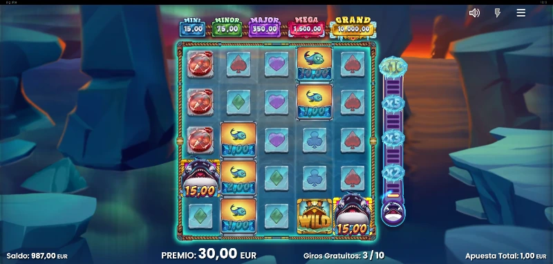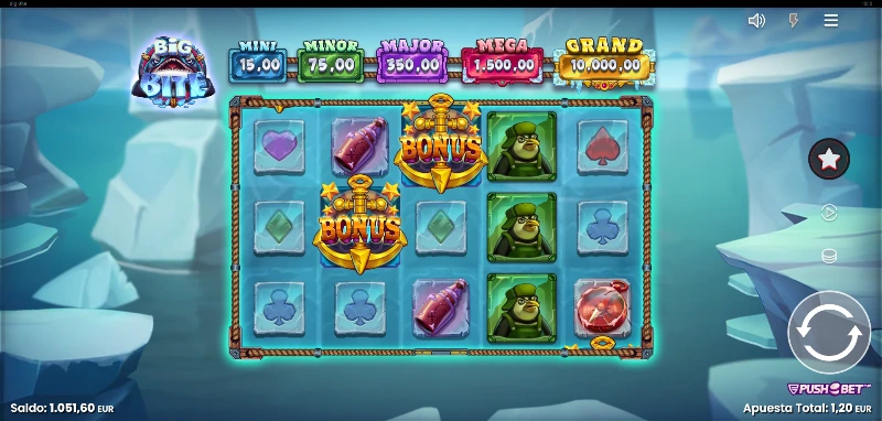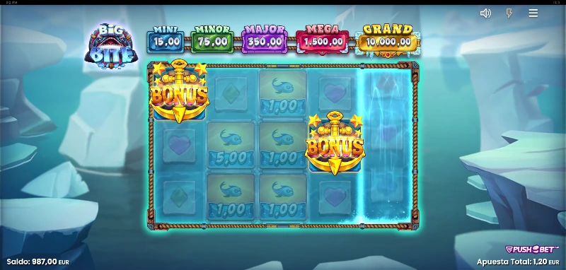 Big Bite 3.8/5 Valoración Sin reseñas Opiniones (0) Push Gaming Proveedor 10 Líneas 100.00€ Apuesta Máx. 0.10€ Apuesta Mín. x10.000 Premio Máx. 5x3 Rodillos 96.33% RTP Media-Baja Volatilidad Jugar gratis Jugar por dinero real Escrito por Valery LemanovActualizado: 15/10/2025 Pros:Tenemos valores elevados en los premios directos (x1.000) y jackpots (x10.000)Un sistema de juego sencillo centrado en la recolección de premios en efectivoFicha técnica ideal para partidas de larga duración Contras:La mecánica sigue siendo bastante genéricaNo sobresale visualmenteBig Bite slot: ¿Puede la orca cazadora desatar el Grand Jackpot x10.000? La tragaperras Big Bite es un juego desarrollado por Push Gaming, lanzado al mercado el 22 de febrero de 2024. Este título transporta a las gélidas aguas árticas donde la orca reina como depredadora suprema será la encargada de cazar esos premios en efectivo de hasta x1.000 la apuesta. Con unas características de volatilidad media-baja, tendremos un estilo de juego que se centrará en la figura recolectora y un bonus de giros gratuitos. ¿Lograremos hacer que esta asesina del ártico se quede satisfecha con todos los premios que se coma? Descúbrelo en la demo Big Bite que encontrarás en este artículo completo de la tragaperras. Temática y ambientación Las aguas árticas se extienden bajo un cielo polar mientras la majestuosa orca patrulla su territorio. Cuidado con lo que buscas, porque tal vez ella tenga apetito de lo mismo que tú. Si logras hacer que trabaje contigo, podrás aprovecharte de su agilidad en el agua y poderosa mandíbula, ¡pero cuidado! ¡No vayas a perder el brazo! Gráficos, animaciones y sonido El estilo visual adopta una estética submarina polar con un acabado pulcro y mate. La paleta cromática mezcla azules y blancos, tanto en los detalles del tablero como en el dinámico fondo helado, con grandes superficies de hielo flotando sobre el agua. Veremos animaciones de luces y dinamismos discretos, pero fluidos. El momento donde sobresale este apartado será a la hora de revelar animaciones de big wins. En cuanto a su banda sonora, tenemos un tema musical calmado, entremezclado con sonidos de la naturaleza de un paisaje salvaje y efectos acuáticos que terminan de ambientar y tematizar esta tragaperras digital. Cómo jugar Big Bite demo slot Esta tragaperras online opera con un tablero de 5 carretes x 3 filas utilizando 10 líneas de pago fijas, donde necesitas agrupar al menos 3 símbolos idénticos desde el carrete izquierdo para generar premios entre x0,40 y x200. Antes de sumergirte en aguas árticas, considera estos consejos básicos para apostar: Establece un bankroll fijo, la volatilidad baja-media genera premios frecuentes con rachas moderadas. El rango de apuesta fluctúa entre 0,10 €/$ y 100 €/$, acomodando diferentes presupuestos. Puedes activar la apuesta anticipada (Push Bet) que aumenta la probabilidad de activar la fase de bonus en un 58%, incrementando tu apuesta un 20%. Consulta la tabla de pagos para entender los valores de los cinco premios con bote, entre otros detalles de interés. Tienes disponible la compra de bonus en la tienda de la slot con diferentes opciones que te detallaremos más adelante. Funciones especiales La experiencia de juego se centra en premios en metálico y la figura recolectora. Esto se complementa con otros símbolos especiales como los que mencionamos a continuación: Símbolo especial Función Wild (Barco) Es un comodín que sustituye a todos los símbolos de pago estándar y paga igual que el símbolo alto más valioso cuando forma líneas propias. Premios directos (Peces) Son premios instantáneos que aparecen en los carretes 2, 3 y 4. Muestra valores entre x1 y x1.000 la apuesta. Premios con bote (Almejas y perlas) Los jackpots aparecen también solo entre los tambores 2 y 4, siendo: Mini (x15), Minor (x75), Major (x350), Mega (x1.500) y Grand (x10.000). Figura recolectora (Orca) Los símbolos collect aparecen en los carretes 1 y 5. Recolecta todos los valores visibles, aplicando su multiplicador (x1 a x10) tanto en el juego base y bonus. Scatter (Ancla) Activa free spins con 3, 4 o 5 en cualquier posición del tablero. Fase de bonus: Tiradas gratuitas con progresión por niveles El bonus de tiradas gratis se activa con 3, 4 o 5 Scatters, otorgando 10 free spins con multiplicador de orca inicial de x1, x3 o x10 respectivamente a cuántos Scatters hayamos reunido. El tablero se expande a 5x5 con 20 líneas de pago, duplicando las oportunidades de conexión. Durante spins gratis, cada orca que aterriza aumenta un nivel al medidor de progresión. Al completar niveles, se otorga un multiplicador persistente a las figuras collect (orcas) y 5 tiradas adicionales: Nivel Multiplicador Nivel 1 x2 Nivel 2 x3 Nivel 3 x5 Nivel 4 x10 Big Bite: Bonus buy Tipo de compra Multiplicador inicial Precio (tu apuesta) Bonus básico x1 x21,50 Bonus intermedio x3 x46,50 Bonus avanzado x10 x106 Bonus aleatorio Alguno de los anteriores x37,50 Big Bite: RTP y volatilidad Retorno al jugador (RTP): 96,33% (96,4% con Push Bet activado) Volatilidad: Baja-Media Premio máximo: x10.000 la apuesta Rango de apuesta: 0,10 €/$ a 100 €/$ Sistema de líneas/pago: 10 líneas de pago fijas (20 líneas en free spins) Desarrollador: Push Gaming Frecuencia de aciertos: N/D Frecuencia de bonus: N/D Mi opinión personal Tenemos un juego de tragaperras que mantiene unos estándares de calidad en cuanto a diseño visual sin sobresalir en su producción. En cuanto a la mecánica de recolección podemos decir lo mismo, es un estilo de juego centrado en premios directos que evitar el Hold & Win y se centra en una figura recolectora que además puede traer consigo multiplicadores aleatorios o un multiplicador persistente en el bonus. Los valores de los premios en efectivo son altos, llegando a x1.000 la apuesta con las figuras de peces y presentando un jackpot x10.000, el premio máximo del juego, lo cual es el d