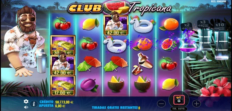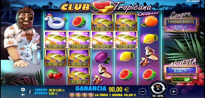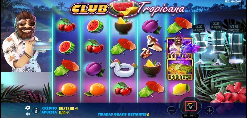 Club Tropicana 3.8/5 Valoración Sin reseñas Opiniones (0) Reel Kingdom Proveedor 12 Líneas 240.00€ Apuesta Máx. 0.12€ Apuesta Mín. x4.000 Premio Máx. 5x4 Rodillos 96.08% RTP Alta Volatilidad Jugar gratis Jugar por dinero real Escrito por Valery LemanovActualizado: 22/07/2025 Pros:Sistema de juego progresivo con hasta 50 spins gratisMultiplicador progresivo en su bonusDisponible la compra de bonus y su ante betBuena temática musical Contras:La mecánica de juego es idéntica a la de Big Bass BonanzaEl comodín sólo se encuentra en el bonusClub Tropicana: ¿Un nuevo clásico veraniego de Reel Kingdom? Siempre es buena ocasión jugar a Club Tropicana, una tragaperras online desarrollada por Reel Kingdom y distribuida por Pragmatic Play desde el 9 de febrero de 2023 entre diferentes operadores y proveedores iGaming. Disfruta de una ambientación veraniega donde el buen ritmo musical y los coloridos cócteles son el decorado perfecto para tus grandes jugadas. De los creadores de la saga Big Bass, Reel Kingdom nos trae el inicio de una nueva saga donde el ocio nocturno nada tiene que ver con la pesca. Te lo detallamos todo en este análisis completo de la tragaperras y una demo gratis para que puedas jugar sin poner en riesgo tu dinero. Temática y ambientación No sabemos si es un famoso pescador, el hermano del protagonista de las tragamonedas Big Bass o simplemente se le parece físicamente. Lo que sí tenemos claro es que aquí venimos a disfrutar de la mejor música y las mejores bebidas preparadas por este gran bartender donde cada copa esconde algún gran premio. ¿Qué nos pedimos para empezar? Gráficos, animaciones y sonido El tema visual es vivo y fiestero con una multitud de colores saturados y con efectos luminiscentes que funcionan muy bien en la línea disco-funky. Las animaciones del bartender son divertidas y responden a los big wins y veremos también ciertos efectos de luces en los momentos de bonus. La música disco con un ritmo funk es magnética e invita a jugar con el volumen encendido y bien alto para poder disfrutarla a ritmo de cada tirada. Cómo jugar Club Tropicana slot El juego se desarrolla en una cuadrícula 5×4 con 12 líneas fijas. Para ganar basta con alinear tres símbolos o más desde la izquierda. Los premios que estos otorgan están entre el x0.50 y el x200 tu apuesta. Una vez conocemos esta información, nos preparamos con nuestro bankroll para esas primeras tiradas: Elige entre la apuesta mínima de 0.12 €/$ y la apuesta máxima 240 €/$. Consulta siempre la tablas de premios que también son las normas del juego. Puedes activar la apuesta anticipada que aumenta tus posibilidades de entrar al bonus por un coste del 50% tu apuesta. También tienes disponible la compra de bonus con giros gratis por un valor equivalente a x100 tu apuesta. ¿Listo para pedirle ese primer giro al bartender? Fase bonus con giros gratis El punto fuerte de Club Tropicana está en su ronda de free spins, que se activa al conseguir 3, 4 o 5 scatters, otorgando 10, 15 o 20 tiradas, respectivamente. En esta fase, los wild bartenders aparecen en los rodillos para recoger los valores de los símbolos dinero (x2 - x4.000 tu apuesta) en pantalla. Cada 4 comodines acumulados durante los giros gratis relanzan la función con +10 tiradas y aumentan el multiplicador progresivo de los símbolos dinero hasta un máximo de 50 free spins y un multiplicador global x10 como máximo. Compra de bonus Si no quieres esperar a que los scatters activen los giros gratis de forma natural, Club Tropicana incluye una opción de compra directa en algunos casinos. Por un coste de x100 la apuesta, puedes acceder a la ronda de giros gratis con el RTP en torno al 96,07 %. Club Tropicana: RTP y volatilidad Retorno al jugador teórico: 96,08 % (puede bajar al 95,07 % o 94,07 % según configuración del operador). Volatilidad: Alta (5/5). Premio máximo: x4.000 la apuesta. Rango de apuesta: 0,12 € – 360 €. Frecuencia de premios base: ~12,8 %. Frecuencia de bonus: 1 cada ~121 giros. Mi opinión personal Club Tropicana sigue siendo un título sólido para quienes disfrutan de las tragaperras online con mecánicas de recolección como en Big Bass Bonanza, pero con un aire más tropical y relajado. Su potencial de multiplicadores progresivos y la interacción constante del bartender lo hacen entretenido y capaz de entregar momentos emocionantes en las rondas especiales. Es una slot online perfecta para quienes disfrutan de las tragamonedas Big Bass pero quieren un cambio de aire más nocturno y adulto. ¿Te ha gustado esta tragaperras? Te recomendamos entonces su segunda entrega Club Tropicana Happy Hour donde los premios y la emoción aumentan de nivel. ¿Listo para probarla? Preguntas frecuentes (FAQ) ¿Puedo jugar Club Tropicana gratis? Juegas gratis con la demo gratuitas que tienes en esta reseña de la slot. ¿Cuál es el RTP y la volatilidad de Club Tropicana? El RTP teórico es del 96,08 %, aunque puede variar según el operador y una alta volatilidad. ¿Cómo se activa el bonus en Club Tropicana? El bonus se activa con 3, 4 o 5 scatters, otorgando 10, 15 o 20 giros gratis. Durante la ronda, los bartenders recogen valores de los símbolos dinero y los multiplicadores aumentan cada 4 comodines acumulados. ¿Qué son los símbolos dinero y cómo funcionan? Los símbolos dinero son cócteles con valores aleatorios (x2–x4.000). Durante los giros gratis, los wild bartenders recogen sus valores y los suman al premio total. ¿Cuál es el premio máximo que se puede ganar? El premio máximo en Club Tropicana slot es de x4.000 la apuesta, alcanzable en la fase de giros gratis con multiplicadores altos. ¿Qué es la opción de compra de bonus? En algunos casinos, puedes comprar directamente la ronda de giros gratis por x100 la apuesta, con un RTP aproximado del 96,07 %. ¿Es compatible con móviles? Sí. Gracias a su desarrollo en HTML5, Club Tropicana funciona sin problemas en dispositivos Androi