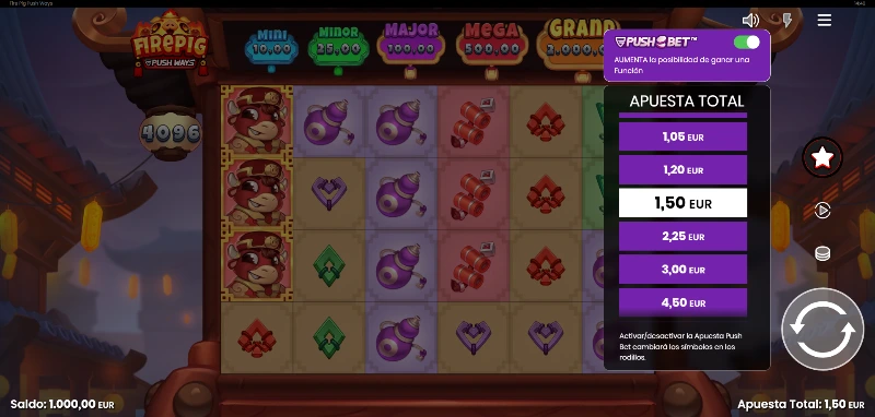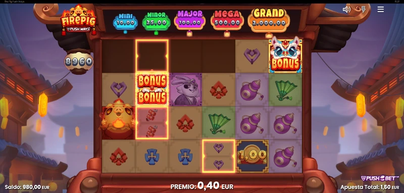 Fire Pig Push Ways 3.5/5 Valoración Sin reseñas Opiniones (0) Push Gaming Proveedor All Ways Líneas 100.00€ Apuesta Máx. 0.10€ Apuesta Mín. x4.941 Premio Máx. 6x4 Rodillos 96.27% RTP Media Volatilidad Jugar gratis Jugar por dinero real Escrito por Valery LemanovActualizado: 22/10/2025 Pros:Un estilo cartoon oriental atractivo y coloridoFunción de carretes dinámicos que aplican split a cualquier figura que rodean, potenciando premios Contras:Valores de pago estándar muy bajos y un Grand Jackpot que no llega al max winEs el mismo juego que Big Bite Push WaysFire Pig Push Ways slot: ¿Qué esconde este colorido festival entre sus funciones? La tragamonedas Fire Pig Push Ways es un juego desarrollado por Push Gaming, lanzado al mercado el 13 de agosto de 2025. Este título representa una variante temática de Big Bite Push Ways, cambiando las gélidas aguas árticas por el vibrante festival oriental del año del cerdo, manteniendo el sistema Push Ways para poder aumentar nuestras formas de ganar. A su vez, tenemos función tumble, efectos de split y un eje central en los premios directos que deberán combinarse con una figura recolectora. ¿Será esta slot de volatilidad media una opción a marcar como favorita este 2025? Lo podrás descubrir por ti mismo en nuestra demo gratuita. Temática y ambientación El festival del año está celebrándose esta noche para honrar a los animales del folklore chino. Parece que el cerdo será el símbolo principal del evento para traernos fortuna, buena suerte y prosperidad. ¿Lograremos que la abundancia nos sonría con él a nuestro lado? Solo hay una forma de descubrirlo, ¡y es metiéndonos de lleno! Gráficos, animaciones y sonido Tenemos una estética cartoon colorida, con formas sencillas y asociadas a los clásicos elementos de del imaginario asiático. Todo ello sobre un fondo con cierto dinamismo con el balancear de los faroles y pequeñas ascuas que flotan en el aire. La animación es fluida y sencilla, sobresaliendo en los momentos que logramos alguna combinación premiada, haciendo que los símbolos exploten cuál fuegos artificiales. En cuanto a su banda sonora, disfrutamos de una melodía suave con un enorme abanico de efectos sonoros que amplían la experiencia visual. Todo ello con cambios de ritmo más acelerados y tensos cuando estamos a punto de conseguir entrar al bonus o lograr una buena jugada. Cómo jugar Fire Pig Push Ways demo slot En esta tragaperras virtual jugamos con un tablero de 6 carretes y 4 a 8 filas con un sistema de líneas de juego dinámico (All Ways). Mientras que desde el primer carrete de la izquierda logremos 3 símbolos iguales consecutivos, recibiremos algún premio entre x0,10 a x2 la apuesta. Tras ver el escenario de esta slot de Push Gaming, vamos con unos consejos para apostar bien: Establece un bankroll fijo, la volatilidad media equilibra premios frecuentes con rachas moderadas. El rango de apuesta fluctúa entre 0,20 €/$ y 200 €/$, acomodando diferentes presupuestos. Puedes activar la ante bet (Push Bet), aumentando tu apuesta un 50% e incrementando la probabilidad de entrar al bonus un 148%. Consulta la tabla de pagos para entender los valores en detalle y mucha más información sobre este juego. Si tu presupuesto lo permite y el operador la tiene habilitada, podrás comprar el bonus pagando x120 tu apuesta. Funciones especiales Esta tragamonedas online construye su experiencia alrededor del sistema Push Ways expandible, Zonas Calientes que duplican símbolos, los Fire Pig colectores, cascadas y free spins con progresión: Funciones ¿Qué es o qué hace? Wild Comodín que sustituye a todos los símbolos de pago estándar para completar combinaciones premiadas. Premios directos Premios instantáneos que aparecen en los carretes 2, 3, 4 y 5. Muestra valores entre x1 y x100 la apuesta. Premios con bote Los jackpots aparecen también solo entre los tambores 2 y 5, siendo: Mini (x10), Minor (x25), Major (x100), Mega (x500) y Grand (x2.000). Figura recolectora (Cerdo de fuego) Los símbolos collect aparecen en los carretes 1 y 6. Recolecta todos los valores visibles, aplicando su multiplicador (x1 a x10) tanto en el juego base como en el bonus. Scatter Activa free spins con 3 o más en cualquier posición del tablero. Cascada Es una mecánica como la función tumble presente en otras slots. Cada vez que una combinación resulta ganadora, los símbolos implicados se eliminan del tablero y son reemplazados por otros que caen desde la parte superior, generando la posibilidad de encadenar múltiples premios dentro de una misma tirada. Hot Zones: ¿Qué aporta esta mecánica Push Ways? El sistema Push Ways es la mecánica responsable de generar lo que el juego denomina Zonas Calientes (Hot Zones). Estas consisten en marcos de 4 casillas que pueden aparecer aleatoriamente en cualquier carrete y que, tras su activación, se desplazan una posición hacia abajo con cada nuevo giro, modificando la estructura del tablero de forma progresiva. Cada Zona Caliente aplica el efecto split, dividiendo en dos los símbolos que cubre y, por tanto, incrementando el número de combinaciones posibles. No pueden coexistir dos zonas sobre una misma posición, de modo que ningún símbolo puede dividirse más de una vez por giro. Este sistema dinámico es el que permite alcanzar hasta 262.144 formas de ganar, ya que amplía las líneas activas a medida que las Zonas Calientes entran en juego. Además, su influencia se extiende a todos los tipos de símbolos, incluidos Scatters, símbolos recolectores, figuras de dinero y jackpots, potenciando tanto el juego base como las rondas de bonus. Bonus de giros gratis La fase de bonificación se activa con 3 o más Scatters, otorgando el siguiente n.º de tiradas gratis y multiplicadores al símbolo recolector: N.º de Scatters Tiradas gratis Multiplicador 3 10 x1 4 11 x1 5 12 x1 6 12 x2 7 13 x2 8 13 x3 9 14 x3 10 14 x5 11 15 x5 12 15 x10 Durante la ronda de giros gratis, do
