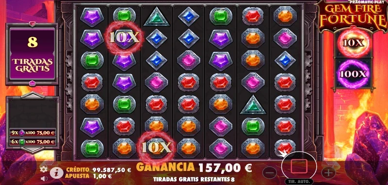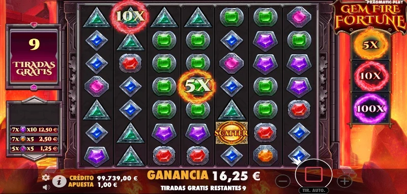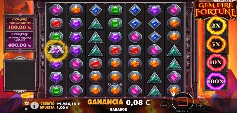 Gem Fire Fortune 3.8/5 Valoración Sin reseñas Opiniones (0) Pragmatic Play Proveedor Cluster Pays Líneas 240.00€ Apuesta Máx. 0.20€ Apuesta Mín. x15.000 Premio Máx. 7x7 Rodillos 96.50% RTP Media-Alta Volatilidad Jugar gratis Jugar por dinero real Escrito por Valery LemanovActualizado: 21/07/2025 Pros:Sistema de juego sencillo y visualmente atractivoDisponible la compra de bonus y superbonusMultiplicadores asegurados en los bonus con las combinaciones ganadoras Contras:Existen otras slots iguales con más funciones especialesSólo es posible acceder al súper bonus comprando la funciónGem Fire Fortune: la slot de Pragmatic Play que enciende las ganancias hasta 15.000x Gem Fire Fortune es la nueva propuesta de Pragmatic Play lanzada el 30 de junio de 2025 con la que jugaremos con 49 iconos para lograr grandes premios. Vamos a empezar ahora con este análisis completo de la tragamonedas en la que también encontrarás una demo gratis sin registro. Temática y ambientación Cuentan las leyendas que existe un templo lleno de gemas y piedras preciosas para los más valientes aventureros y buscadores de tesoros. Adéntrate en el interior de las antiguas ruinas con ríos de magma y trata de sobrevivir para poder volver con las gemas de fuego de la fortuna. Gráficos, animaciones y sonido Tenemos un estilo gráfico colorido y limpio con figuras de gemas engarzadas en diferentes bases de plata creando una sensación opulenta y de riqueza en pantalla. Las animaciones de luces son atractivas y sutiles, donde la banda sonora transmite un ritmo natural y ligeramente misterioso con percusión en madera y metal, junto con instrumentos de viento y madera. Cómo jugar Gem Fire Fortune slot Esta tragamonedas virtual funciona sobre una cuadrícula 7×7 donde las combinaciones ganadoras se forman con grupos de al menos 5 símbolos idénticos adyacentes gracias a la mecánica cluster pays. Las gemas de colores pagan distinto según tamaño del cluster, con valores que van desde x0.20 hasta x35 tu apuesta. Además, cada vez que hay una combinación, los símbolos ganadores desaparecen y caen nuevos gracias a la función tumble. Para poder empezar vamos a seguir las siguientes indicaciones: Ajusta tu apuesta entre 0,20 €/$ y 240 €/$ tu apuesta según tu bankroll. Consulta la tabla de pagos para conocer valores de cada símbolo y las reglas básicas. Activa el autoplay si prefieres automatizar giros. Ten en cuenta que los multiplicadores aleatorios pueden aparecer en cualquier caída. Empieza cuando quieras. ¡Suerte en tus giros! Funciones especiales La mecánica de juego de esta tragamonedas de gemas de fuego de la fortuna se centra en su sistema de cascadas y multiplicadores aleatorios con valores entre x2, x5, x10 y x100. Esta aparición de multiplicadores estará condicionada por el random number generator o RNG. Esta combinación de funciones la encontramos tanto en el juego base como en las diferentes fases de bonus. Fases bonus con tiradas gratis Existen dos fases bonus distintas que consisten en free spins con rodillos especiales y multiplicadores garantizados para cada combinación ganadora. Aquí tienes sus características principales a tener en cuenta para tu estrategia a la hora de jugar a esta tragaperras online: Tipo de bonus Cómo se activa Multiplicadores posibles Tiradas adicionales Normal 3+ scatters 5×, 10× o 100× +5 con 3+ scatters Súper Desde la compra de bonus 10× o 100× +5 con 3+ scatters Compra de bonus Bonus normal: cuesta 100× tu apuesta total y ofrece la ronda estándar con multiplicadores 5×, 10× o 100×. Su retorno al jugador (RTP) se vuelve del 96.51%. Superbonus: cuesta 400× tu apuesta total y garantiza que todas las combinaciones ganadoras se multipliquen exclusivamente por 10× o 100×. Su RTP se vuelve del 96.49%. Gem Fire Fortune: RTP y volatilidad Return to player (RTP): 96,50 % (puede variar entre operadores hasta 94,52 %). Volatilidad: media-alta. Premio máximo: x15.000 la apuesta. Rango de apuesta: 0,20 €/$ – 240 €/$. Frecuencia de premios: ~39,37 % (1 cada 2,54 giros). Frecuencia de bono: ~1 cada 452 giros. Mi opinión personal En este simulador de tragaperras tendremos una buena combinación de estética y mecánica eficaz y sencilla con la que podremos jugar sin complicaciones. El sistema de multiplicadores aleatorios junto con la función en cascadas con un pago por clusters es una sinergia que funciona tanto en jugadores clásicos como modernos. Aunque es cierto que la slot Gems Bonanza que lanzaron al mercado en octubre de 2020 tiene el mismo sistema de juego, pero con mayores funciones. Su volatilidad medio-alta y menos funciones hacen que sea una tragamonedas digital muy atractiva para los high rollers y también para jugadores que no quieren juegos con multitud de funciones caóticas. Preguntas frecuentes (FAQ) ¿Puedo jugar Gem Fire Fortune gratis? Puedes jugar a la demo gratis en nuestro análisis de la slot online. ¿Cuál es el RTP y volatilidad de Gem Fire Fortune? El RTP es del 96,50 % y alta volatilidad. ¿Cuál es el premio máximo en Gem Fire Fortune? Puedes ganar hasta 15.000 veces tu apuesta en una sola ronda. ¿Dónde puedo jugar Gem Fire Fortuna? Disfruta en alguno de los mejores casinos online dentro de nuestro ranking. Casinos para jugar a Gem Fire Fortune 4.8/5 4.7/5 4.7/5 4.6/5 4.6/5 4.5/5 4.5/5 4.5/5 4.5/5 4.4/5 4.5/5 4.5/5 4.4/5 4.4/5 4.4/5 4.5/5 4.4/5 4.4/5 4.4/5 4.4/5 4.5/5 4.3/5 4.3/5 4.2/5 4.0/5 4.4/5 4.3/5 4.3/5 4.3/5 4.3/5 Bono200€80 tiradas gratis200€200€ + 30 FS200€$5,000 MXN$5,000 MXN$4,000 MXN$4,000 MXN$10,000 MXN + 25 FSS/1,000S/200S/2,500S/5,000S/500$200,000 CLP$200,000 CLP$400,000 CLP$220,000 CLP$1,400,000 CLP$213,000 ARS1,000 USD1,500 USD$12,000 ARS$60,000 ARS$1,000,000 COP$100,000 COP$250,000 COP$20,000 COPSin datosDepósito mínimo10€10€10€10€10€$100$20 MXN$50$50$100S/10S/30S/50S/50S/50$8500$8500$8000$800$500$55010 USD$500$70Según método de depósito$1,000$500$1,000$1,000$5,000