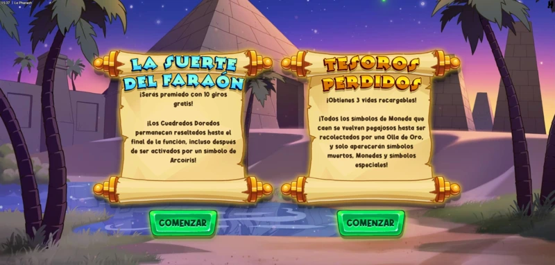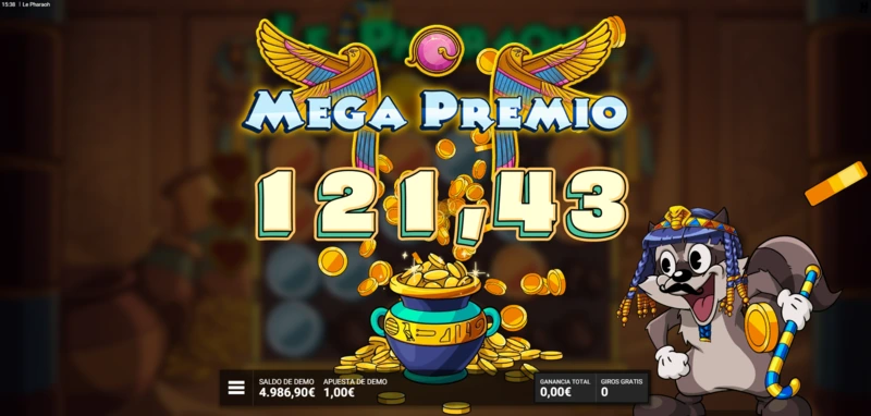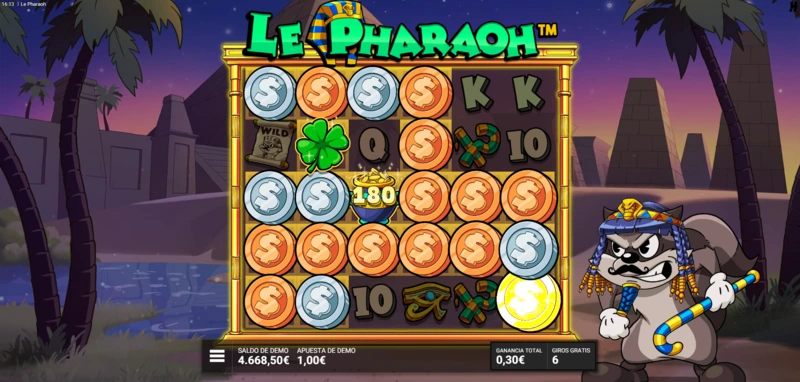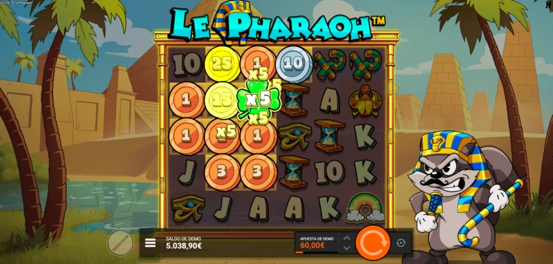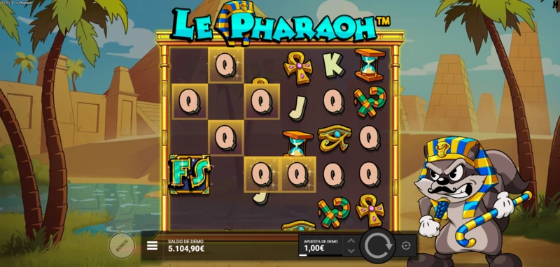 Le Pharaoh 4.6/5 Valoración Sin reseñas Opiniones (0) Hacksaw Gaming Proveedor 19 Líneas 100.00€ Apuesta Máx. 0.10€ Apuesta Mín. x15.000 Premio Máx. 6x5 Rodillos 96.18% RTP Media Volatilidad Jugar gratis Jugar por dinero real Escrito por Valery LemanovActualizado: 15/04/2025 Pros:Buena sincronía entre funciones y una original experiencia de juegoDisponible la opción de compras de bonus y otras funcionesEl estilo visual sigue siendo divertido y Smokey carismáticoMúltiples fases bonus con poderosas funciones Contras:La fase de 5 scatters sólo está disponible mediante el juego baseEs extremadamente complicado lograr el máximo bonusLe Pharaoh: ¿El bandido ahora es el faraón de las slots? Smokey, el mapache de Hacksaw Gaming, ha tenido que huír de París y venir a las pirámides de Le Pharaoh. Una nueva estratagema por parte del mapache es hacerse con los antiguos tesoros de las pirámides de Egipto, ¿le funcionará su plan maestro? La slot Le Pharaoh salió al mercado el 26 de septiembre de 2024 después del parisino éxito con la tragaperras Le Bandit del 2023. Te contamos todos sus detalles en este análisis completo del juego. ¿Preparado? Temática y ambientación ¿Qué hace un mapache vestido de faraón caminando entre las pirámides? ¡Ah! Es Smokey de nuevo con algún plan poco honrado entre manos. Por lo visto al mapache lo pillaron en París con las manos en la masa y tuvo que salir corriendo. Ahora recorre la zona de alrededor de las pirámides haciéndose fotos para los turistas con El Faraón mientras averigua cómo apoderarse de los secretos del Antiguo Egipto en su propio estilo. ¿Quieres unirte a su plan? Tú verás, porque rara vez le salen tal como planea. Gráficos, animaciones y sonidos Al empezar a jugar Le Pharaoh, nos recibe un Egipto dibujado al más puro estilo cartoon, con colores planos y detalles claros. Acompaña Smokey en pantalla cada giro con su postizo bigote y un atuendo al más puro estilo de faraón. Las animaciones de Smokey mantienen sus expresiones divertidas que transmiten toda la personalidad del mapache, incluso cuando las tiradas no resultan favorables. Sus comentarios y cambios de look se ven afectados cuando logramos algún big win o conseguimos entrar al bonus. La música ofrece melodías egipcias reinterpretadas con un ritmo ligero y cómico que encaja con el tono del juego. Consigue que el sonido se perciba como parte esencial de la experiencia de juego. Cómo jugar Le Pharaoh slot Jugamos sobre una cuadrícula de 6 carretes por 5 filas y cuenta con 19 líneas de pago fijas que premian combinaciones de izquierda a derecha. Se aleja del sistema de clusters que conocíamos en Le Bandit, pero lo complementan con nuevas mecánicas modernas como símbolos pegajosos. Para que se logre una combinación ganadora son necesarios al menos 3 símbolos iguales en una de las líneas de juego. Estas combinaciones tienen un rango de premios entre x0.10 y x3 tu apuesta total. Conociendo estos detalles, podemos ahora dejar preparadas unas breves indicaciones de cómo empezar a jugar a la tragamonedas: Ajusta tu apuesta dentro del rango disponible, desde 0,10 €/$ hasta 100 €/$ por giro. Consulta la tabla de pagos para familiarizarte con las combinaciones y valores. Puedes activar el modo automático y establecer límites de pérdidas o ganancias según tu presupuesto. Las combinaciones siguen un sistema sticky respins, que significa que se quedan pegadas y generan un regiro para aumentar el potencial premio. El símbolo arcoíris activa los recuadros amarillos que se crean en los sticky respins para activar una de las mecánicas principales del juego. ¡Mucha suerte en tus giros! Funciones especiales La mecánica del juego cambia en comparación a la entrega del 2023, pero mantiene una sinergia efectiva entre funciones. Además, tendremos esta vez dos tipos de fases de bonus que elegiremos cuando logremos 3 o 4 scatters, aunque seguiremos jugando también con ciertas figuras clásicas como es el Wild y scatter: Wild: un pergamino hace de cartel de búsqueda con la foto de Smokey en Egipto. Actúa como comodín con cualquier símbolo de pago y si se alinean 6 seguidos paga x3 la apuesta. Scatter (FS): desbloquea las fases bonus según la cantidad obtenida (entre 3 y 5). Una vez tenemos claros los símbolos más populares, vamos ahora con su sistema de juego de regiros pegajosos (sticky respins). ¿Cómo funcionan los regiros pegajosos en Le Pharaoh? Combinación ganadora. Cuando haces una tirada normal y obtienes una combinación ganadora, los símbolos que forman parte de esa combinación se quedan pegados en el tablero. Activación de respin gratuito. Inmediatamente después, el resto de símbolos caen, y los espacios vacíos se rellenan con símbolos nuevos en un respin automático. Ampliación de la combinación. Si en el respin los nuevos símbolos prolongan la combinación inicial o generan una nueva combinación, estos también se quedan pegados junto con los anteriores. Nuevos respins. Se repite el proceso siempre que se prolongue o genera una combinación con premio dentro de las líneas de juego. Fin de la secuencia. La secuencia termina cuando ya no aparecen nuevos símbolos que amplíen la combinación ganadora. En ese momento, se pagan todas las ganancias acumuladas de la secuencia. ¿Cómo funcionan los golden squares en la slot egipcia de Smokey? Los golden squares o marcos de oro, aparecen cuando logras una combinación ganadora. Estas casillas marcadas inician la función de regiros pegajosos, pero además pueden desvelar una amplia variedad de premios en metálico si coinciden en el mismo giro con un símbolo arcoíris. Estos símbolos pueden ser los que mencionamos a continuación: Elemento Función Monedas Otorgan premios instantáneos según su color y valor (bronce, plata u oro) con un rango que va desde x0.2 hasta x500 tu apuesta total. Trébol de cuatro hojas Aplican un multiplicador a los premios en efectivo adyac