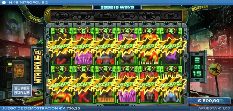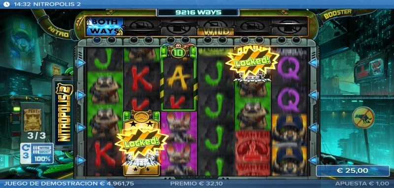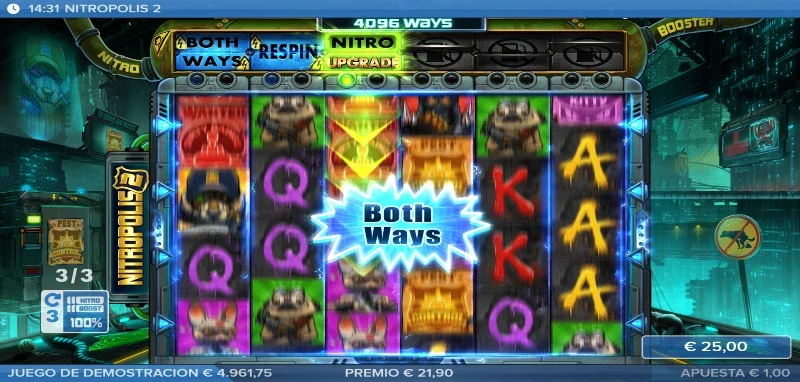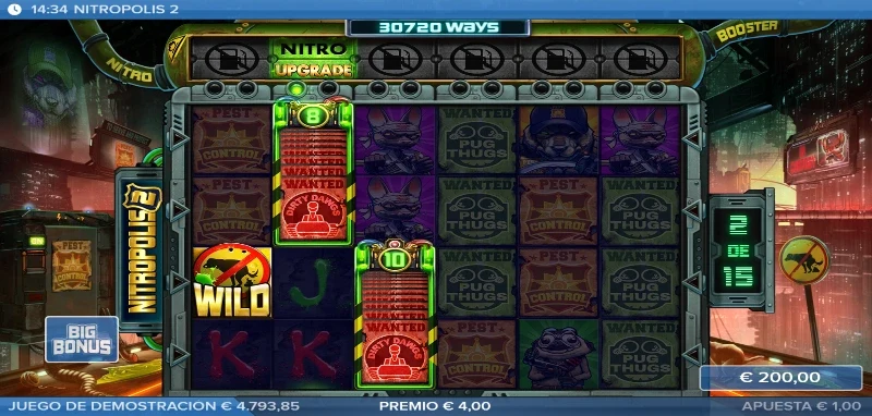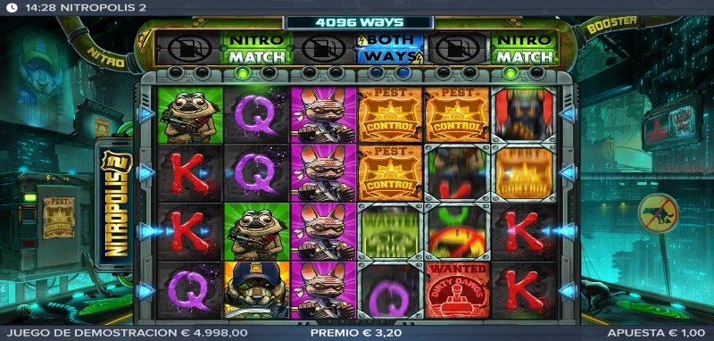 Nitropolis 2 4.2/5 Valoración Sin reseñas Opiniones (0) ELK Studios Proveedor All Ways Líneas 100.00€ Apuesta Máx. 0.20€ Apuesta Mín. x10.000 Premio Máx. 6x4 Rodillos 96.10% RTP Alta Volatilidad Jugar gratis Jugar por dinero real Escrito por Valery LemanovActualizado: 18/09/2025 Pros:Nuevas funciones que mejoran los tambores de Nitro con una fila nueva encima del tableroAlto nivel visual, una excelente banda sonora y un storytelling que se desarrollaNuevas y mejores compras de efectos y bonusMantenemos la función sticky en el bonus para los carretes Nitro Contras:El rango de premios en las combinaciones de pago estándar desciende mucho en las figuras de alto valorSe ha perdido el pago por Scatter en el juego de bonus que teníamos en el originalEl RTP baja 1 punto entero frente a la primera entregaTragaperras Nitropolis 2: ¿Quién diablos es ese lobo con placa y mala leche? Nitropolis 2 slot es la segunda entrega de la distópica saga de ELK Studios, lanzada el 27 de abril de 2021. Tras el éxito de la primera parte, esta secuela vuelve a ponernos en las calles de la ciudad del nitro verde. Las cosas han cambiado con la presencia de un nuevo personaje y por lo visto ahora se han encontrado nuevas formas de aprovechar el súper combustible. Te lo contamos todo en la reseña completa de la tragamonedas para que te prepares con la mejor estrategia de juego, y si eres más de probar que de leer, tienes disponible totalmente gratis la demo Nitropolis 2 para jugar sin registro. Temática y ambientación Parece que la Ciudad del Nitro ha conocido a la horma de su propio zapato y se llama Sargento Nitro Wolf. El nuevo Sargento es un hueso duro de roer que supone una amenaza mucho más grande de lo que imaginábamos. No sabíamos lo que se nos venía encima y por culpa de nuestras disputas internas han encerrado al líder de los Canallas Ratas, pero esto se acaba aquí. Vamos a tener que ponernos serios y enseñarle a ese lobito quiénes son los verdaderos reyes de Nitropolis. ¿Te unes a la lucha o tienes pensado quedarte ahí mirando? Gráficos, animaciones y sonido La estética mantiene el trazo grueso y los colores saturados, con un nivel de detalle más cuidado. Tenemos también mayor dinamismo en pantalla, sea en el cambio de fase con el coche del Sargento destrozando el tablero, o un fondo con efectos que enriquecen las partidas con su toque de humor característico. Por otro lado, las animaciones siguen siendo impresionantes con el giro de carretes, el arder de los Nitro Reels o los nuevos efectos que provocan la nueva fila horizontal Nitro Booster. En cuanto a la música, tenemos una base de mezclas con una voz tremulante, ruido de policías, aullidos caninos y mucho más todo con un toque house muy chulo. Cómo jugar Nitropolis 2 slot y demo La estructura base es la misma que en la primera entrega; un tablero de 6 carretes y 4 filas, con un sistema All Ways de 4.096 formas de ganar. Sin embargo, podemos superar las 85 millones formas de ganar en los momentos más caóticos gracias a los Nitro Reels. Las combinaciones premiadas descienden bastante en los pagos altos, con premios de entre x0.10 y x3 por combinaciones de pago. En cuanto a cómo organizar nuestra partida, os aconsejamos seguir los siguientes pasos: Ajusta tu bankroll y define tu apuesta entre 0,20 €/$ y 100 €/$. Consulta la tabla de pagos en el menú junto con otros ajustes y normas de juego. Activa autoplay si quieres programar hasta 100 giros automáticos. Tienes disponible el bonus buy X-iter donde podrás comprar diferentes funciones. Funciones especiales En esta secuela seguiremos disfrutando de los Carretes Nitro, pero además tendremos un nuevo potenciador con la nueva línea superior llamada Nitro Booster que nos ofrecerá mejoras en los respectivos carretes si hay un Nitro Reel debajo. Los efectos varían y pueden afectar a todo el tablero o solo una columna, por lo que los vamos a explicar en la siguiente tabla: Función Nitro Booster Descripción Nitro Match Los símbolos de los Nitro Reels que haya debajo se sincronizan con el de la izquierda para crear una combinación mayor. Nitro Upgrade Mejor los símbolos y aumenta el número del Nitro Reel. Nitro Wild Convierte los Nitro Reels en comodines. Respin Independientemente de si hay o no un carrete Nitro, todo el tablero sufre un respín mientras que los Nitro Reels se quedan fijos. Mientras que el carrete nitroso no desaparece, su contenido sí sufre también un regiro. All Match Todos los tambores Nitro se igualan a un solo símbolo. All Premium Mejora los símbolos a figuras de alto valor en los Nitro. All Wild Todos los tambores Nitro tendrán comodines. Both Ways En este giro las combinaciones se premian en ambas direcciones. Bonus con giros gratis El bonus free spins mantiene la estructura del primer juego consiguiendo hasta 25 tiradas gratuitas cuando reunimos entre 3 y 6 Scatters. La mecánica de los Sticky Nitro Reels sigue vigente, es decir que cuando aparece uno en pantallas durante el bonus este se queda pegado hasta el final de la fase. Podremos reactivar el bonus si conseguimos otros 3 o más Scatters, consiguiendo el número de tiradas correspondientes (entre 10 y 25 spins). Nitropolis 2: Bonus buy Nombre Descripción Precio Premio seguro Asegura una lína ganadora en la tirada. x5 la apuesta Nitro Boost Se activan durante 3 spins, los 6 carretes de la nueva fila horizontal superior. x25 la apuesta Bonus seguro Entrada directa al bonus. x100 la apuesta Big Bonus Acceso al bonus con 15 tiradas mínimo. x200 la apuesta Súper Bonus Bonus con 12 Nitro Reels desde el inicio del bonus. x500 la apuesta Nitropolis 2: RTP y volatilidad Return to Player (RTP): 95 % Volatilidad: Alta Premio máximo: x10.000 la apuesta Rango de apuesta: 0,20 €/$ – 100 €/$ Formas de ganar: All Ways, hasta 85 millones Frecuencia de premios: ~22 %; alrededor de 1 de cada 5 tiradas tienen premio. Frecuencia de bonus: 1 de cada 200–250 giros. Mi opinión p
