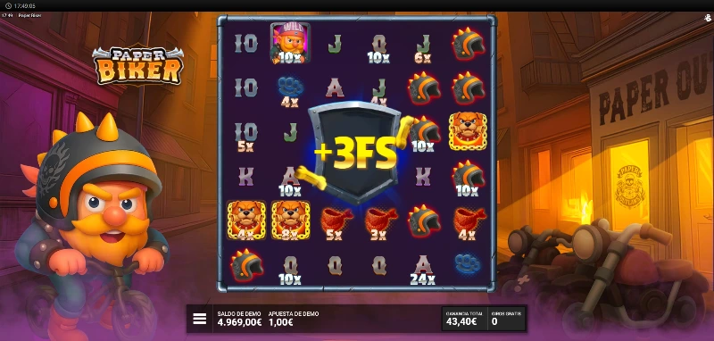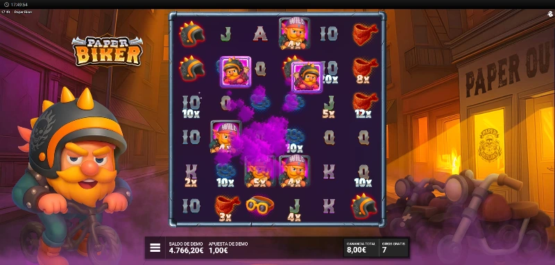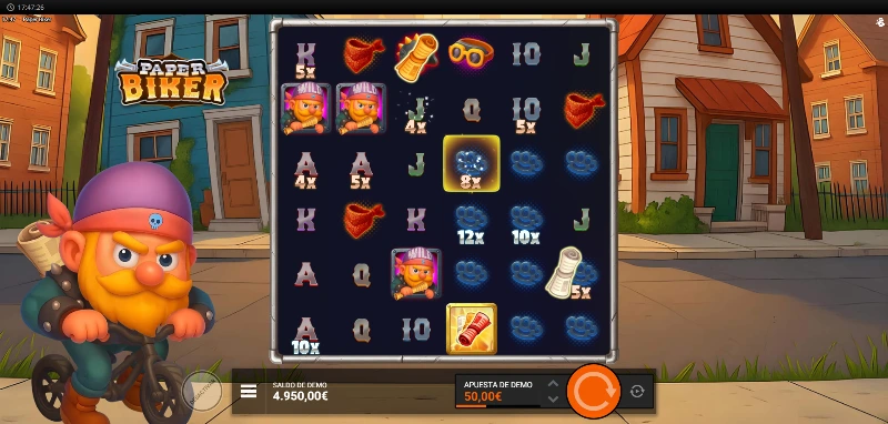 Paper Biker 4.3/5 Valoración Sin reseñas Opiniones (0) Hacksaw Gaming Proveedor Cluster Pays Líneas 100.00€ Apuesta Máx. 0.10€ Apuesta Mín. x15.000 Premio Máx. 6x6 Rodillos 96.24% RTP Media-Alta Volatilidad Jugar gratis Jugar por dinero real Escrito por Valery LemanovActualizado: 11/10/2025 Pros:Divertida temática con un muy buen apartado audiovisualFantástica mecánica conjunta de cascadas y multiplicadores en casillaEl símbolo del periódico ofrece multitud de funcionesDisponible la compra de dos bonus y giros especiales Contras:Los niveles de bonus de 4 y 5 Scatters son muy flojos para el estilo Hacksaw de fases con 3 partesPaper Biker slot: ¿Puede un repartidor de periódicos desatar multiplicadores de x15.000? La tragaperras Paper Biker es un juego desarrollado por Bullshark Games, un estudio adherido al programa OpenRGS (Remote Gaming Server) de Hacksaw Gaming. Fue lanzada al mercado el 23 de septiembre de 2025 y rescata la nostalgia de los repartidores de periódicos estadounidenses y la fusiona con la cultura biker en un formato de 6 carretes x 6 filas. Esta slot de volatilidad media-alta opera con un sistema de clusters y multiplicadores que pueden alcanzar el max win de x15.000. ¿Conseguirá Bullshark Games entregar premios tan efectivos como los periódicos matutinos? Descúbrelo probando la demo Paper Biker disponible en esta reseña completa del juego. Temática y ambientación La vida da muchas vueltas, y nuestro protagonista lo sabe bien. Este curtido ángel del asfalto, con su espeso bigote y barba, ha sido testimonio de cómo el destino le arrebataba su preciada bestia de hierro, pero eso no ha apagado su espíritu rebelde. Ahora recorre las calles en bicicleta, repartiendo periódicos casa por casa con la misma actitud desafiante de siempre. Porque una vez motero, siempre motero, aunque sea a dos pedales. Gráficos, animaciones y sonido Apuesta por una estética de fondos cómic y un personaje dibujado tipo toy-like con una paleta cromática que mezcla amarillos soleados y tonos rojizos que contrastan con ciertos azules y verdes. El fondo presenta profundidad con casas en perspectiva y una atmósfera ciertamente hogareña. Tenemos un dinamismo de lluvia de hojas bien alineada con esa paleta de colores otoñal, que además refuerza cierta romantización con un estereotipo de vida en las afueras. El resto de animaciones destacables las encontraremos dentro del tablero, con una tenues pero atractivas animaciones variadas que vemos tanto al lograr premios o activar ciertos símbolos con funciones. La música es una base de rock alternativo instrumental con un sonido limpio en el que se mezcla la guitarra eléctrica que lleva la parte protagonista, una base de percusión que marca el compás y un marcado bajo que acompaña a la percusión. Cómo jugar Paper Biker demo slot Esta tragaperras online opera con un tablero 6 carretes x 6 filas utilizando el sistema Cluster Pays, donde necesitas agrupar al menos 5 símbolos idénticos tocándose horizontal o verticalmente para generar premios que oscilan entre x0,10 y x150 tu apuesta base según el símbolo y tamaño del clúster. Antes de comenzar tu ruta de reparto con esta slot de Bullshark Games, considera estos pasos esenciales para jugar con control: Establece un bankroll fijo para tu sesión y respeta este límite independientemente de los resultados. El rango de apuesta oscila entre 0,10 €/$ y 100,00 €/$ por tirada. Consulta la tabla de pagos integrada para conocer los valores exactos de cada símbolo según tu nivel de apuesta. Utiliza el autoplay si deseas mantener un ritmo constante sin intervención manual y activa el turbo si quieres que las animaciones sean más rápidas (en la barra de menú de tres rayas). Tendrás disponible la compra de bonus que incluye también opciones de ante bet y otro tipo de tirada potenciada. Si activas una de las tiradas especiales (naranjas), estas no se desactivan hasta que vuelvas a pulsar sobre el bonus. Funciones especiales Esta tragamonedas online construye su experiencia alrededor del sistema de cascadas y multiplicadores acumulativos que se potencian mutuamente. En cuanto a las figuras más importantes del juego, son las tres siguientes que os mencionamos: Símbolo especial Función Wild El motorista hace la función de comodín con cualquier símbolo de pago estándar. Scatter El perro será el encargado de hacer que entremos en la fase de tiradas gratuitas. Lograremos entre 8 y 12 giros sin coste según cuántos Scatters reunamos. Rollo de periódico Símbolo especial que añade multiplicadores y activa funciones adicionales durante el juego base y bonus Multiplicadores acumulables: ¿A cuantos más periódicos más premios? El símbolo del Rollo de Periódico es la pieza central del juego base y junto a las free spins en la fase especial. Cada vez que aparece en la cuadrícula, puede activar un diferentes celdas con multiplicadores aleatorios, generar comodines adicionales y transformarse en un Wild al terminar su función. El color del periódico hará que los valores que pueda aplicar como multiplicador varíen, siendo así: Color del rollo Rango de multiplicadores Blanco x2, x3, x4, x5 Naranja x10, x12, x15, x20 Rojo x25, x50, x75, x100 Cuando cae el Rollo de Periódico, activa entre 3 y 10 celdas aleatorias, asignando a cada una un multiplicador basado en su color. Si una celda con multiplicador es impactada nuevamente, su valor se duplica. Las celdas impactadas con símbolos Wild pueden generar de 2 a 6 Wilds extra en posiciones aleatorias (nunca sobre símbolos especiales). En aquellas casillas que un símbolo de casco reciba un impacto, además de aplicarse ahí un multiplicador, un símbolo aleatorio de bajo valor se transforma en símbolos de casco. El propio Rollo de Periódico se convierte finalmente en un símbolo Wild regular, manteniendo su multiplicador activo. Nota: los símbolos Wild extra solo se añaden una vez por cascada, incluso si el mi