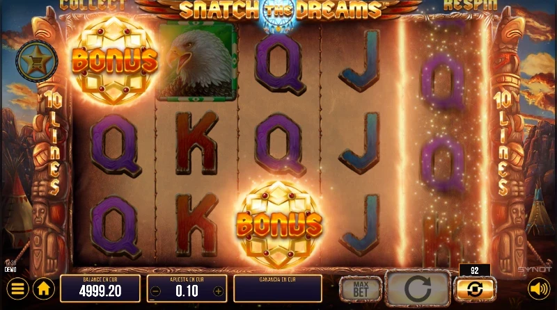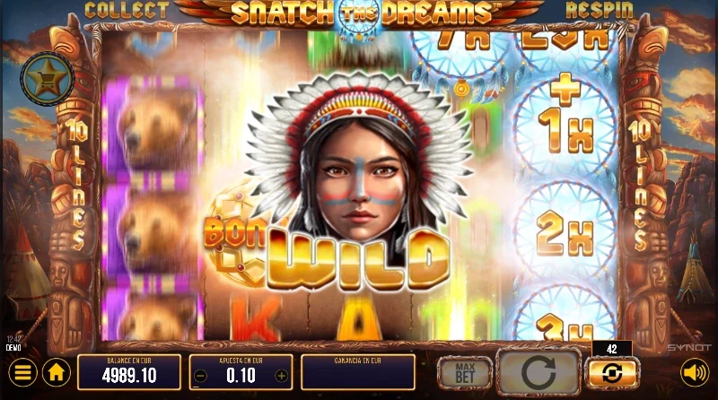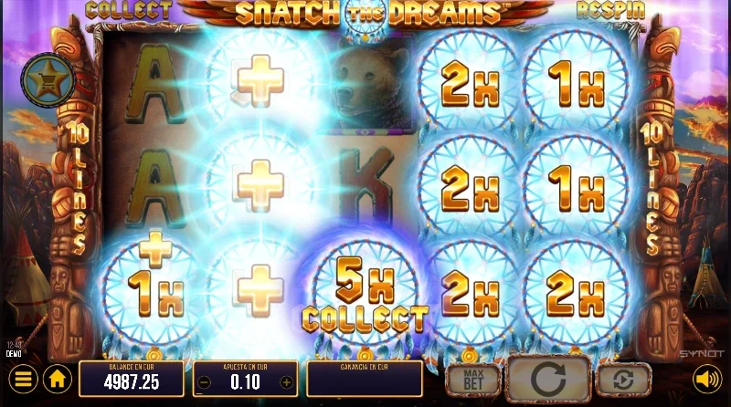 Snatch The Dreams 4.4/5 Valoración Sin reseñas Opiniones (0) Synot Proveedor 10 Líneas 200.00€ Apuesta Máx. 0.10€ Apuesta Mín. x1.000 Premio Máx. 5x3 Rodillos 97.90% RTP Media-Baja Volatilidad Jugar gratis Jugar por dinero real Escrito por Valery LemanovActualizado: 11/08/2025 Pros:Funciones aleatorias con potenciales big winsEl sistema de premios en metálico tiene sus propios símbolos con funcionesRecolección automática de premio en efectivo en el bonusDisponible comprar tanto los regiros o free spins Contras:Los valores de la figura collect y respin tienen un límite x10 el valor de la apuestaUn sistema de premios con bote sería la guinda de esta slot digitalSnatch the Dreams: ¡Atrapasueños! ¿Atrapa premios? Lanzada el 20 de marzo de 2025 por Synot Games, Snatch the Dreams es una tragaperras online que combina una atmósfera místico-nativoamericana con mecánicas innovadoras. Sus dreamcatchers (atrapasueños) esta vez tendrán un poder todavía mayor que el de protegernos de las pesadillas. Disfruta de la slot gratis gracias a la versión demo y del análisis del juego con el que conocer todas sus mecánicas y secretos. ¿Preparado para empezar? Temática y ambientación Bajo el cielo estrellado de las grandes llanuras, el murmullo del viento acaricia las sagradas cuentas y plumas de los atrapasueños. Cuelgan en la penumbra, filtrando las pesadillas y dejando pasar solo las visiones más puras. Allí, entre cantos tribales y el resplandor de la luna, comienza un viaje donde los espíritus de la naturaleza y la magia se entrelazan para guiarte hacia un destino tejido en sueños. ¿Te atreverás a recorrerlo hasta el final? Gráficos, animaciones y sonido Con un estilo visual retro y colorido tenemos un juego de tragaperras que sigue cierto corte tradicional en las figuras del tablero. Por el otro lado, el nivel de detalle que tiene la cuadrícula y el fondo del juego es igual de fantástico que su alto nivel de animación donde podemos verlo destacas en los juegos de luce que nos avisan de premios y otras mecánicas. En cuanto su melodía con toques oníricos está compuesta más por un abanico de sonidos que recorren la línea ambiental de cierta magia asociada con antiguos rituales estereotipados de ciertas prácticas de los nativos americanos. Cómo jugar Snatch the Dreams slot La cuadrícula de 5×3 con 10 líneas de juego fijas tiene un sistema clásico de recogida de premios con al menos 3 símbolos alineados desde el primer carrete de la izquierda. Estos otorgarán premios que van desde x0.5 hasta x50 veces lo apostado en líneas completas. Jugaremos también con funciones aleatorias que explicaremos más adelante, pero antes queremos brindaros unos consejos fáciles para poder apostar en una slot online; Ajusta tu apuesta mínima de 0,10 €/$ o aumenta hasta la apuesta máxima de 100 €/$ en esta versión. Consulta la tabla de pagos para conocer las combinaciones en detalle. Activa el autoplay si quieres automatizar hasta 100 giros. Podrás comprar el bonus de regiros por un total de x30 la apuesta o el bonus de tiradas gratuitas por x70 veces tu apuesta. Los símbolos atrapasueños son el principal protagonista para conseguir funciones especiales. Por último, decide tu bank y, ¡Que comiencen los giros! Funciones especiales En esta tragamonedas virtual tendremos varios frentes abiertos para conseguir buenos premios. Todas las funciones del juego base podrán ocurrir también durante la fase de bonus debido a la compatibilidad entre todas ellas (quitando una figura con función). Disfrutaremos de premios en efectivo, tiradas con respins, funciones aletorias y spins gratis. Empecemos por las funciones aleatorias y sus efectos: Función aleatoria Descripción Wild Booster Añade hasta 15 comodines extra en los carretes para aumentar las combinaciones ganadoras. Bonus Booster Surgen dos Scatters en los rodillos 1 y 2. Snatch the Dreams En medio de un giro, el juego dispara hasta 15 símbolos de premios en efectivo en todo el tablero. Entre ellos habrá una figura collect. En cuanto a los premios instantáneos tenemos que conocer que sus valores van desde x1 y hasta x50 la apuesta pudiendo aparecer en el juego base y bonus. En cuanto a su funcionamiento y símbolos especiales os contamos lo siguiente: Símbolo especial Descripción Figura collect Aparece en el rodillo 3 y recoge instantáneamente todos los valores monetarios visibles en los carretes. Sólo aparece en el juego base. Figura respin Puede aparecer en el carrete 3 y otorga una tirada adicional manteniendo bloqueados los valores en pantalla para intentar sumar más premios. Cada nuevo símbolo de dinero que caiga, provoca un nuevo respin. Suma Añade su valor al resto de símbolos monetarios visibles antes de la recogida. Símbolo expansivo Se expande para cubrir el carrete completo. Bonus con tiradas gratis Conseguir 3, 4 o 5 símbolos Bonus otorga respectivamente 5, 10 o 20 free spins. Durante esta ronda, todos los valores de de símbolos en efectivo se recogen automáticamente por lo que la figura de recolección desaparece. Snatch the dreams: RTP y volatilidad Retorno al jugador: entre 85,1 % y 97,9 % según versión y operador. La demo interna disponible en nuestro sitio muestra un 93,92 %. Volatilidad: Media-baja, ideal para quienes buscan premios frecuentes. Premio máximo: hasta ×1.000 la apuesta. Rango de apuestas: de 0,10 a 200 €/$ según el operador donde juegues. Frecuencia de premios: alrededor del 20 % según el propio estudio en su página web.. Mi opinión personal Una máquina tragaperras con un buen apartado visual y una ambientación bien lograda. Además, tenemos una combinaciones de mecánicas eficaz que se centra en los premios en efectivo y potenciándolos en las diferentes funciones como la recolección automática del bonus o sus símbolos especiales que aumentan sus valores o se expanden en tambores completos. Las funciones aleatorias son parte del juego base, pero el he