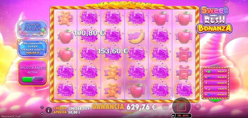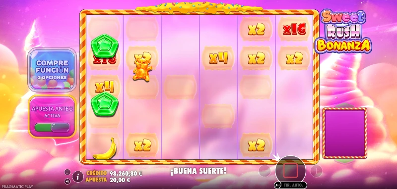 Sweet Rush Bonanza 4.2/5 Valoración Sin reseñas Opiniones (0) Pragmatic Play Proveedor Scatter Pays Líneas 240.00€ Apuesta Máx. 0.20€ Apuesta Mín. x5.000 Premio Máx. 6x5 Rodillos 96.50% RTP Alta Volatilidad Jugar gratis Jugar por dinero real Escrito por Valery LemanovActualizado: 30/09/2025 Pros:Multiplicadores progresivos de hasta x128 tanto en el juego base como en el bonusNuevas opciones de apuestas anticipadas con dos tipos de bonus buyMecánica de multiplicadores persistentes en la fase de free spins Contras:Tiene la menor frecuencia de premios comparándola con sus dos slots originalesUn max win de x5.000 muy limitado teniendo en cuenta que Sweet Bonanza supera los x21.000El pago directo de los Scatters es mucho menor que en Sweet BonanzaSweet Rush Bonanza slot: ¿Pragmatic Play reinventa sus clásicos más dulces? Pragmatic Play lanzó el 29 de septiembre de 2025 la tragaperras Sweet Rush Bonanza, una fusión dos de sus franquicias más exitosas: Sweet Bonanza y Sugar Rush. Con una alta volatilidad y un max win x5.000, tenemos una de las primeras entregas de otoño que combina el sistema de pago Scatter Pays con la mecánica de multiplicadores progresivos a lo largo de toda la cuadrícula. ¿Puede esta combinación de mecánicas consolidadas crear algo realmente nuevo o estamos ante algo mucho más cotidiano? Esto solo lo podrás averiguar de dos formas: prueba la demo Sweet Rush Bonanza que tenemos publicada en esta reseña o investiga en nuestro análisis de la slot y comparte tu opinión en la sección de comentarios al final del todo. Temática y ambientación Nos vamos a un mundo repleto de caramelos, frutas glaseadas y golosinas de colores vibrantes. El universo es un parque de atracciones de confitería producto de la fusión temática entre ambas sagas: los símbolos de frutas características de Sweet Bonanza conviven con las gominolas en forma de ositos de Sugar Rush. Gráficos, animaciones y sonido El estilo visual apuesta por gráficos en alta definición con acabados brillantes que hacen que cada símbolo parezca comestible. Las frutas —sandías, uvas, ciruelas— presentan un acabado glaseado riquísimo a la vista, mientras que las gominolas muestran texturas detalladas con reflejos de luz cuidados. Las animaciones son una combinación de alto nivel de detalle, fluidez y brillo en los momentos de combinaciones premiadas. Se suma a esto también un dinamismo en pantalla cuando activamos alguna de las apuesta anticipadas que nos elevan a un cielo de algodón de azúcar. O la explosión de caramelos a pantalla completa con el cambio entre el juego base y la fase de bonus. En cuanto al sonido, tenemos una banda sonora alegre, con mucho ritmo, que cambia su estilo pop a un matiz más disco de los 80 cuando logramos entrar en la fase de tiradas gratis. Cómo jugar Sweet Rush Bonanza demo slot Se juega en una cuadrícula de 6 carretes × 5 filas con sistema de Scatter Pays, lo que significa que los símbolos pagan en cualquier posición cuando aparecen al menos 8 iguales simultáneamente. Los premios con un solo tipo de símbolo oscilan entre x0,25 y x50 la apuesta, dependiendo de la cantidad y el valor del símbolo. Para empezar a jugar recomendamos seguir los siguientes consejos para apostar en una tragamonedas digital: Establece tu bankroll y decide cuánto estás dispuesto a arriesgar en la sesión Selecciona tu apuesta dentro del rango disponible: desde 0,20 €/$ hasta 240 €/$ Consulta la tabla de pagos para conocer los valores de cada símbolo y cómo funcionan los multiplicadores Activa autoplay o modo turbo si prefieres acelerar el ritmo de las tiradas Considera la opción Ante Bet (disponible según el operador) que ofrece tres tipos de opciones que cuestan x3, x20 y hasta x250 tu apuesta. Compra el bonus si tu presupuesto te lo permite y tu estrategia de juego incluye esta acción. Tendrás tanto una opción estándar por x100 tu apuesta y una súper pagando x500 lo apostado. Funciones especiales Función Descripción Scatter pays + Función cascada A diferencia de las líneas de pago tradicionales, esta tragamonedas online utiliza un sistema de Pay Anywhere donde necesitas reunir 8 o más símbolos iguales en cualquier posición de la pantalla para obtener un premio. Tras cada victoria, los símbolos ganadores desaparecen y caen nuevas figuras desde arriba, permitiendo victorias consecutivas en una sola tirada. Multiplicadores progresivos Cuando ocurre una combinación premiada, en sus casillas pertinentes se activa un multiplicador donde si vuelve a ocurrir una nueva combinación en la misma casilla, esta activa un multiplicador x2 que duplicará su valor con cada nueva combinación que ocurre en ella hasta un máximo de x128. Los multiplicadores se acumulan entre sí si forman parte de la misma combinación. Desaparecen con la siguiente tirada normal que realicemos. Bonus con giros gratis Con 4 o más Scatters se otorgan 10 free spins. En esta fase las posiciones marcadas y sus multiplicadores son persistentes entre giros hasta el final del bonus. Se puede reactivar el bonus con 4 o más Scatters nuevos en pantalla. Sweet Rush Bonanza: Bonus buy y ante bet Función Descripción Precio Tiradas gratis Tiradas gratis estándar x100 Supertiradas gratis Multiplicador x2 en todas las posiciones de la cuadrícula x500 Ante 1 x10 más posibilidad de activar la función x3 Ante 2 Multiplicador inicial aleatorio en un número aleatorio de posiciones x20 Ante 3 Multiplicador inicial x32 en toda la cuadrícula x250 El retorno al jugador (RTP) no cambia del 96,50% independientemente de la opción que se compre o active. Sweet Rush Bonanza: RTP y volatilidad RTP: 96,50% (versión estándar), con variantes de 95,50% y 94,50% Volatilidad: Alta Premio máximo: x5.000 la apuesta Rango de apuesta: 0,20 €/$ - 240 €/$ Sistema de pago: Scatter Pays (8+ símbolos iguales) Hit frequency: ~ 26,59 %, lo que equivale a 1 victoria ~ cada 3,76 giros. Frecuencia del bono: